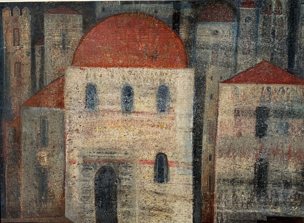 Verso auf dem Deckkarton in schwarzem Filzstift signiert Max von Moos, daneben in schwarzer Feder wiederholt signiert, datiert und betitelt Max von Moos / 1966 / Städtebild / Oel; Künstleretikett mit Titel.